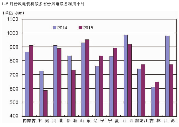 分類型看,1-5月份,全國水電設備平均利用小時1142小時,同比提高57小時;水電裝機容量超過1000萬千瓦的7個省份中,湖南、青海和云南同比分別下降179小時、31小時和9小時,湖北和四川同比分別增長140小時和30小時,貴州、廣西同比分別提高458小時、380小時。全國火電設備平均利用小時1813小時,同比下降186小時,降幅比2014年同期擴大169小時;其中青海2493小時,海南、寧夏、江蘇、江西、河北、陜西和貴州超過2000小時;云南和西藏火電設備利用小時低于1000小時,分別為878小時和48小時;與上年同期相比,共有27個省份火電利用小時同比下降,其中,北京、云南、寧夏、四川和重慶下降超過400小時。全國核電設備平均利用小時2793小時,同比下降49小時。全國風電設備平均利用小時857小時,同比下降6小時(詳情見圖)。