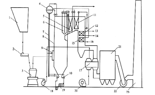 1. 原煤斗;2.給煤機;3.磨煤機;4.汽包;5.高溫過濾器;6.屏式過熱器;7.下降管;8.爐膛水冷壁;9.燃燒器;10.下聯(lián)箱;11.低溫過熱 器;12.再熱器;13.再熱蒸汽出口;14.再熱蒸汽進口;15.省煤器;16.給水;17.空氣預熱器;18.排粉風機;19.排渣裝置;20.送風 機;21.除塵器;22.引風機;23.煙囪