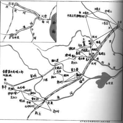 北平通往各抗日根據(jù)地秘密交通線示意圖。