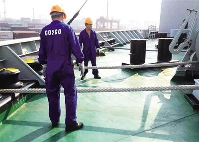 下圖 中遠“西班牙號”的水手們在整潔干凈的甲板上工作。
