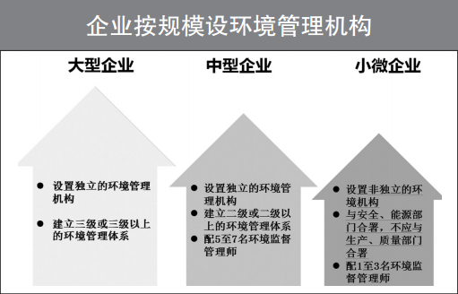 河北省提出,大型企業(yè)要設(shè)置獨立的環(huán)境管理機(jī)構(gòu),建立三級或三級以上的環(huán)境管理體系。中型企業(yè)設(shè)置獨立的環(huán)境管理機(jī)構(gòu),建立二級或二級以上的環(huán)境管理體系,配5~7名環(huán)境監(jiān)督管理師。小微企業(yè)可設(shè)置非獨立的環(huán)保機(jī)構(gòu),與安全、能源部門合署,不應(yīng)與生產(chǎn)、質(zhì)量部門合署,配1~3名環(huán)境監(jiān)督管理師。