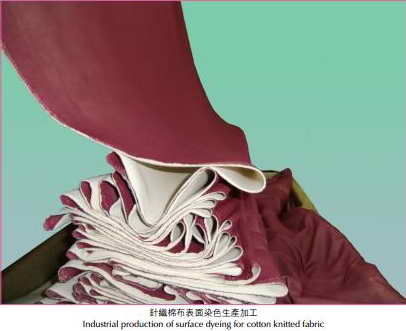 本研究發(fā)明了應(yīng)用活性染料對(duì)棉針織布進(jìn)行表面染色的技術(shù)。經(jīng)表面染色的針織布可以做具有牛仔服裝水洗效果的時(shí)裝。因只進(jìn)行表面染色,染料及化學(xué)助劑的用量不到常規(guī)染色方法的一半,可顯著降低污染,綠色環(huán)保。