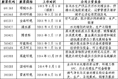 到2015年5月底,A股市場共有42家環(huán)保上市公司,占全部A股上市公司總數的1.67%。尤其是在創(chuàng)業(yè)板推出后上市的22家環(huán)保公司中有17家在創(chuàng)業(yè)板上市,反映出環(huán)保公司作為新興發(fā)展公司,普遍體量小、高科技、高成長的特點,同時也顯示出創(chuàng)業(yè)板的開啟為眾多環(huán)保公司上市融資、發(fā)展擴張?zhí)峁┝饲八从械臋C會。