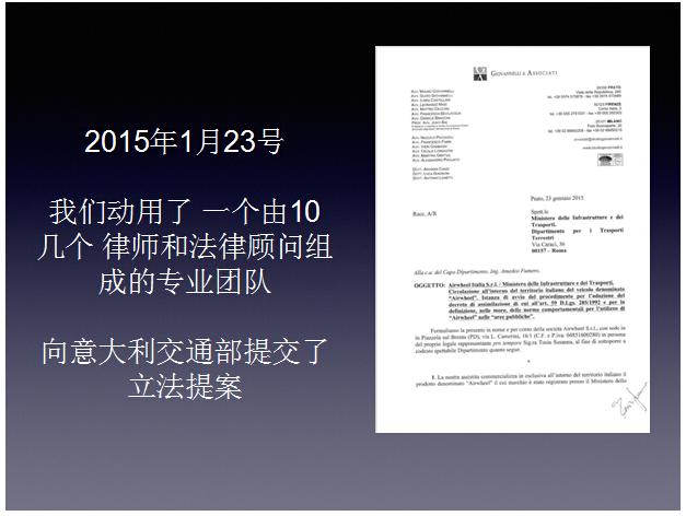 平衡車作為近幾年新興的交通出行工具,目前很多國(guó)家的平衡車市場(chǎng)都面臨著法律法規(guī)的不完善及空缺。對(duì)此,Airwheel意大利代理商在2015年1月23號(hào),積極組織了一個(gè)由十幾名專業(yè)律師和法律顧問組成的專業(yè)團(tuán)隊(duì),向意大利交通部提交了立法提案申請(qǐng)。希望平衡車能在意大利當(dāng)?shù)啬軌蜃鳛槌鲂薪煌üぞ哂枰詮V泛使用。