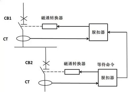 其工作原理為:1)斷路器CB2的出線發(fā)生故障時(shí),CB2斷路器斷開(kāi),將故障切除。2)斷路器CB2發(fā)生故障時(shí),斷路器CB2的脫扣器自動(dòng)向上級(jí)斷路器CB1的脫扣器發(fā)出信號(hào),使CB1由原來(lái)整定的脫扣時(shí)間改為延時(shí)時(shí)間,倘若超過(guò)了延時(shí)時(shí)間,斷路器CB2仍然不跳閘,此時(shí)斷路器CB1發(fā)生跳閘切除故障。3)如果斷路器CB2發(fā)生故障后的故障電流遠(yuǎn)遠(yuǎn)大于其承受能力,斷路器CB1無(wú)論收到CB2的信號(hào)與否,都即刻跳閘切除故障。