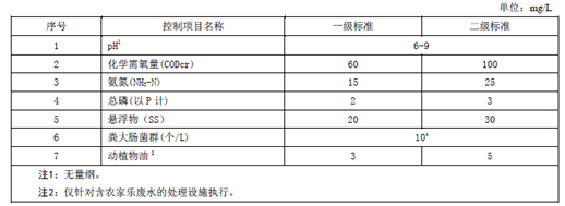 根據農村生活污水主要來源、水質特征等,《標準》確定了pH值、化學需氧量、氨氮、總磷、懸浮物、糞大腸菌群、動植物油等7項主要控制指標及限值。重要水系源頭、重要湖泊集水區(qū)等水環(huán)境功能重要地區(qū)執(zhí)行較高的一級標準,其他地區(qū)執(zhí)行二級標準。