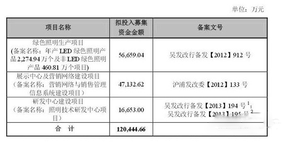 根據(jù)歐普照明招股書,公司擬公開發(fā)行新股不超過(guò)5,800萬(wàn)股擬募集資金約12億,將用于“綠色照明生產(chǎn)項(xiàng)”、“展示中心及營(yíng)銷網(wǎng)絡(luò)建設(shè)項(xiàng)目”、“研發(fā)中心建設(shè)項(xiàng)目”。