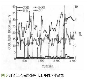 由圖5可以看出,經(jīng)混凝氣浮—臭氧/活性炭處理后,出水COD在9.6~35.0mg/L之間,氨氮在0.3~3.0mg/L之間,BOD在0.1~10.2mg/L之間,pH在6.2~8.3之間,各項指標均能穩(wěn)定達到一級排放標準要求。