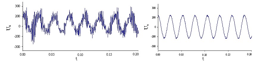 如圖5、6所示,圖5是安裝節(jié)電器前的A相電壓波形,圖6為安裝節(jié)電器后的A相電壓波形,橫軸為時(shí)間單位s,縱軸坐標(biāo)Ua為電壓v。如圖可知,配電系統(tǒng)節(jié)電器有效的濾除了諧波,使A相波形變得平穩(wěn)。同時(shí),根據(jù)現(xiàn)場(chǎng)實(shí)驗(yàn)數(shù)據(jù)得到,在相同負(fù)載,相同電源情況下,經(jīng)分析、計(jì)算得出安裝節(jié)電器前后諧波量下降2 %~5%,有效降低電能損耗。