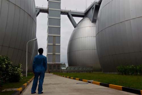 上海白龍港污水處理廠,一名工人走過卵形污泥消化池。寇聰澎湃資料