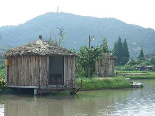 沿著東苕溪沿岸,進(jìn)入道場(chǎng)浜村,不多久,我們就見(jiàn)到了九里紅生態(tài)農(nóng)莊。近處,幾個(gè)大魚塘碧波蕩漾,遠(yuǎn)處,復(fù)墾后的礦山綠意盎然。