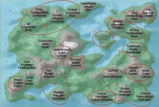 利用TI平臺的Thememap功能繪制的煤氣化技術(shù)的重點技術(shù)分布圖(圖4),可以看到煤氣化專利申請的熱點主要包括以下幾個方面:(1)煤氣利用,包括①一氧化碳和氫氣合成氣、②煤氣化發(fā)電、③煤氣還原煉鐵等;(2)煤氣化工藝流程,包括⑤煤燃燒、焦分離、⑥地下氣化技術(shù)、⑧加氫氣化技術(shù)、⑨金屬催化、?生物質(zhì)催化等;(3)過程控制及環(huán)保技術(shù)研究,包括④排渣除灰、⑦脫硫技術(shù)、?煤氣化廢水處理技術(shù)等;(4)氣化裝置/設(shè)備研究,包括⑩流化床技術(shù)、?氣化設(shè)備及部件等。