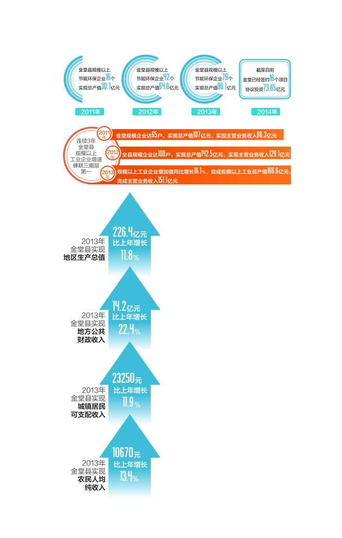 2011年,金堂縣規(guī)模以上節(jié)能環(huán)保企業(yè)有16個,實現(xiàn)總產(chǎn)值30.1億元;2012年,金堂縣規(guī)模以上節(jié)能環(huán)保主導(dǎo)產(chǎn)業(yè)企業(yè)達42個,實現(xiàn)總產(chǎn)值64.6億元;2013年,這兩個數(shù)字分別刷新為79個、96.1億元;2014年,截至目前,金堂已經(jīng)簽約16個項目,協(xié)議投資73.65億元,可以說,基本實現(xiàn)了節(jié)能環(huán)保產(chǎn)業(yè)在成都的倍增發(fā)展。