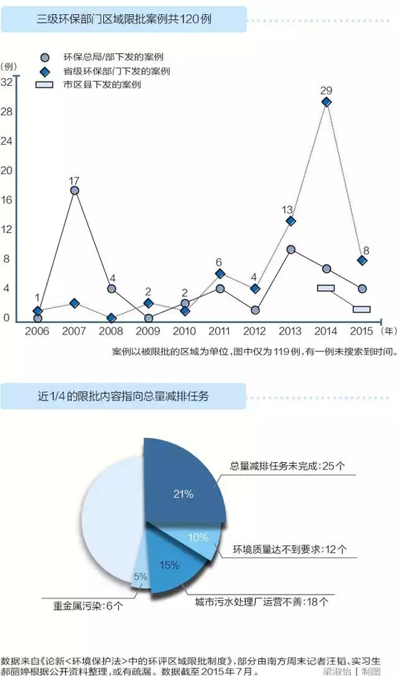——從內(nèi)容而言,限批的內(nèi)容也多有變化。竺效的論文提到,在2013年以前,限批的內(nèi)容比較廣泛,除污染防治、循環(huán)經(jīng)濟(jì)、生態(tài)恢復(fù)項(xiàng)目外,任何項(xiàng)目均可能被限批。而在2013年后,限批的內(nèi)容較為集中,主要對(duì)新增COD(化學(xué)需氧量)和氨氮排放以及燃煤機(jī)組新、改、擴(kuò)建項(xiàng)目的限批。而南方周末記者的統(tǒng)計(jì)發(fā)現(xiàn),2014年之后,限批項(xiàng)目的確有集中于具體污染物的趨勢(shì),但也有完全限批的規(guī)定,例如山東、安徽、江西就曾對(duì)“所有涉及廢水排放的建設(shè)項(xiàng)目”限批。