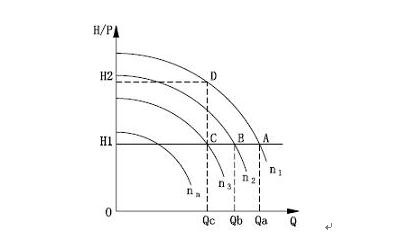 圖1為水泵調(diào)速時(shí)的全揚(yáng)程特性(H-Q)曲線。橫坐標(biāo)為水泵流量Q,縱坐標(biāo)為水泵揚(yáng)程H。泵的揚(yáng)程和出水壓力是線形關(guān)系,因此也可近似表示為出水壓力P。H1A是恒壓線,n是不同轉(zhuǎn)速下的H-Q特性??梢?,在n1轉(zhuǎn)速下,如果通過控制閥門開度使流量從Qa減小到Qc時(shí),壓力將沿n曲線升高到D點(diǎn)。很顯然,在減少流量同時(shí),提高了壓力(DC段是壓力升高值)。如果將轉(zhuǎn)速由n1減小到n,則流量沿著恒壓線從Qa減小到Qc時(shí),而壓力沒變。