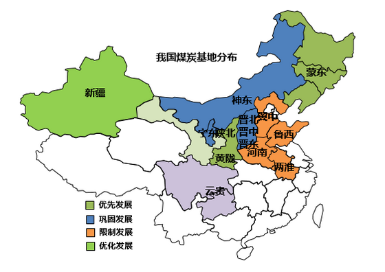 同時,面對能源賦存條件的限制,“十三五”規(guī)劃的能源生產(chǎn)布局是“五基兩帶”,即東北、山西、鄂爾多斯、西南、新疆5大能源基地,核電及海上2個能源開發(fā)帶。其中,14個大型煤炭基地的產(chǎn)煤量占全國煤炭產(chǎn)量的比重在“十三五”期間將達到95%以上。由于煤炭供給過剩,因此對煤炭基地的規(guī)劃將劃分層次,區(qū)別對待。優(yōu)先開發(fā)蒙東、黃隴和陜北基地,鞏固發(fā)展神東、寧東、山西基地,限制發(fā)展東部即冀中、魯西、河南、兩淮基地,優(yōu)化發(fā)展新疆基地。新疆基地將在“十三五”之后發(fā)揮更大作用。
