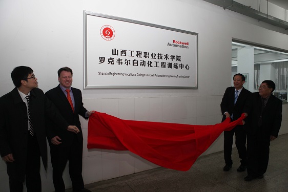 羅克韋爾自動(dòng)化全球大學(xué)項(xiàng)目總監(jiān)Michael Cook先生(左二)和山西工程職業(yè)技術(shù)學(xué)院校長(zhǎng)劉勇先生(右后)共同為實(shí)驗(yàn)室揭牌