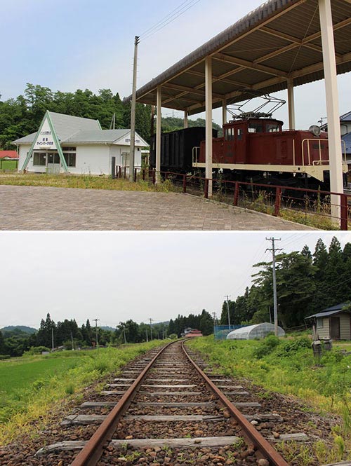 圖3:鐵道仍殘存。2007年廢棄的原Kurihara田園鐵道細倉Mine Park站。站房和機車還在(上)。周圍除了鐵軌(下)外,還留有大片的宿舍建筑和拆除后的空地等,使人聯(lián)想到往日的情形(攝影:日經(jīng)BP社)