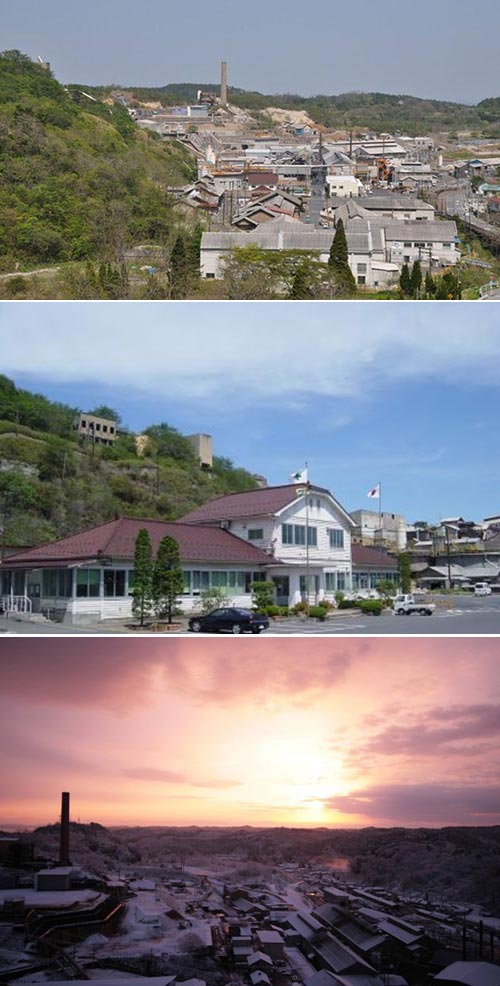 圖2:細倉金屬礦業(yè)的總部和細倉礦山。據(jù)稱鼎盛時期有3000名工人。礦山內(nèi)的全貌(上),從正門可以看到事務(wù)所(左下),雪景和日出(右下)(攝影:細倉金屬礦業(yè))