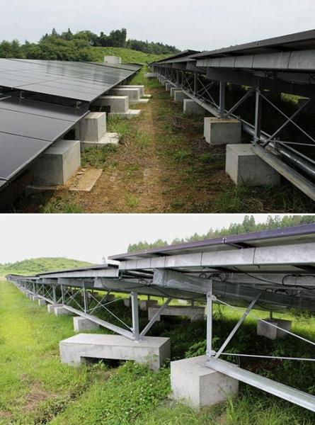 而在排水溝上方要設(shè)置太陽能電池板之處,則使用了形似橋墩與橋板一體化的橋梁形狀混凝土基礎(chǔ)跨過排水溝,在上面安裝了架臺。