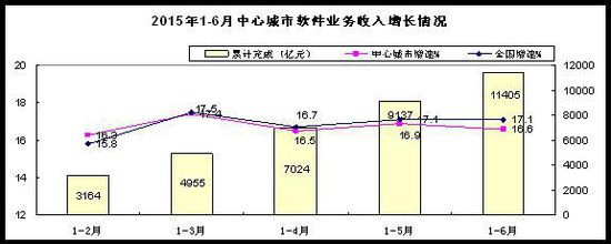 上半年,全國15個副省級中心城市實現(xiàn)軟件業(yè)務(wù)收入11405億元,同比增長16.6%,增速比一季度和去年同期下降0.8和7個百分點,低于全國平均水平0.5個百分點。其中半年完成軟件業(yè)務(wù)收入超千億元的中心城市達到6個,比去年新增4個。中心城市的軟件產(chǎn)品收入同比增長15.2%,高于一季度2.1個百分點;信息技術(shù)服務(wù)同比增長18%,低于一季度2.9個百分點;嵌入式系統(tǒng)軟件收入同比增長14.9%,低于一季度0.1個百分點。