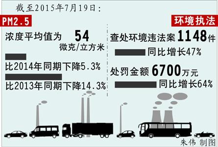 今年截至7月19日,上海PM2.5濃度平均值為54微克/立方米,比2014年同期下降5.3%,比2013年同期下降14.3%。上半年,黃浦江和蘇州河總體水質(zhì)有所改善,市級(jí)和鎮(zhèn)級(jí)飲用水源地水質(zhì)達(dá)標(biāo)率同比分別上升10%和5.3%;查處環(huán)境違法案件和處罰金額同比分別增長(zhǎng)47%和64%;上海市第六輪環(huán)保三年行動(dòng)計(jì)劃共安排的232個(gè)項(xiàng)目,已啟動(dòng)165個(gè),啟動(dòng)率達(dá)71%。