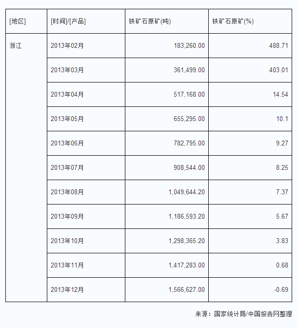 2013年浙江鐵礦石原礦生產(chǎn)量及增速情況