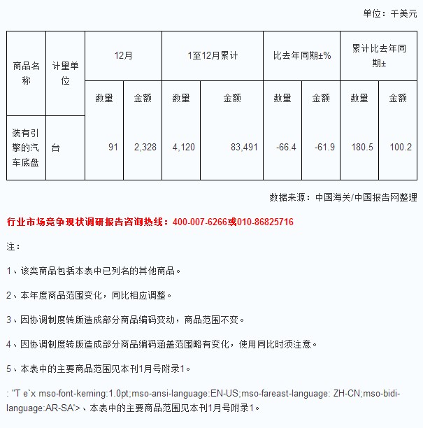 2013年1-12月中國(guó)裝有引擎的汽車底盤出口量及增速統(tǒng)計(jì)