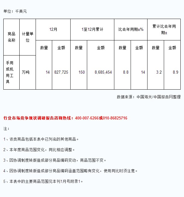 2013年1-12月中國(guó)手用或機(jī)用工具出口量及增速統(tǒng)計(jì)