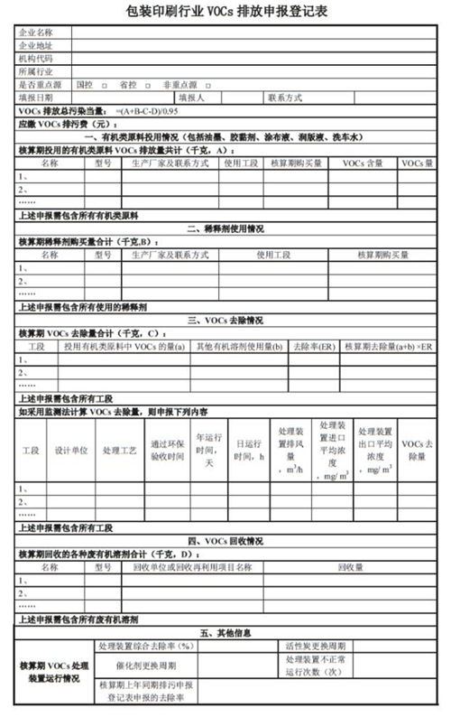 1. 排污者應在規(guī)定期限內(nèi)向地方環(huán)境保護主管部門報送《試點行業(yè)VOCs排放申報登記表》(見下圖),申報VOCs排放量。