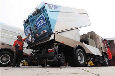 昨日,北京會(huì)議中心,新型純電動(dòng)環(huán)衛(wèi)洗掃車(chē)亮相,將承擔(dān)紀(jì)念反法西斯戰(zhàn)爭(zhēng)勝利70周年活動(dòng)的路面清掃工作。