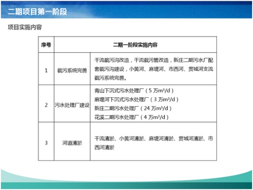 二期項(xiàng)目又分為兩個(gè)階段,一階段建設(shè)時(shí)間為2014年7月~2015年6月,投資金額21.52億,其治理方案經(jīng)市政府、省環(huán)保廳、省住建廳、省科技廳組織的國(guó)家三部委水環(huán)境治理專家論證;二階段建設(shè)時(shí)間為2015.7~2016.6,投資金額為16.27億。二期項(xiàng)目的部分內(nèi)容是一期的延續(xù),包括河道清淤、支流的水環(huán)境治理、污泥和生態(tài)治理等。截污系統(tǒng)完善方面包括干流截污溝改造,干流截污管改造,新莊二期污水廠配套截污溝建設(shè),小黃河、麻堤河、市西河、貫城河支流截污系統(tǒng)完善;清淤工作包括干流清淤、小黃河清淤、麻堤河清淤、貫城河清淤、市西河清淤。另有部分內(nèi)容則是積極爭(zhēng)取的創(chuàng)新之舉:在二期污水廠建設(shè)方面,按照當(dāng)時(shí)貴陽(yáng)市規(guī)劃的要求,是在南明河下游規(guī)劃建設(shè)集中式大型的污水處理廠(規(guī)模40萬(wàn)噸左右),然而,經(jīng)過充分的調(diào)研分析,中國(guó)水環(huán)境集團(tuán)建議在沿河修建十來個(gè)5萬(wàn)噸規(guī)模的污水廠,統(tǒng)一規(guī)劃、就地處理、就地排放。結(jié)合沿河污水收集系統(tǒng)、建廠費(fèi)用及中水回用投資進(jìn)行成本計(jì)算,可為市政府節(jié)約了十幾億的投資成本。