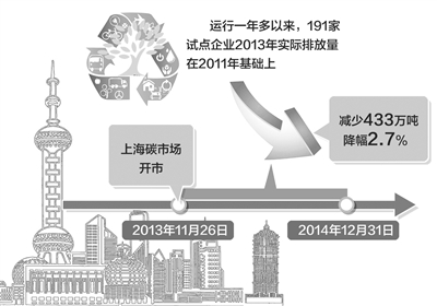 據(jù)《上海碳市場報告(2013-2014)》顯示,上海碳市場自2013年11月26日開市,運(yùn)行一年多以來,交易量穩(wěn)步攀升,參與主體逐漸增多;191家試點(diǎn)企業(yè)2013年實際排放量在2011年基礎(chǔ)上減少433萬噸,降幅2.7%。碳交易作為碳減排工具的作用初步顯現(xiàn)。
