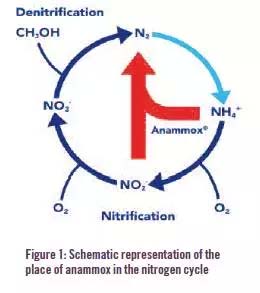 厭氧氨氧化技術尤其適合處理厭氧產(chǎn)甲烷工藝的出水,這種出水通常都含有很高濃度的氨氮,這些氨氮是由含氮有機物在厭氧過程中被降解而產(chǎn)生。這種出水中往往只有相對較低的BOD,因為大部分的有機質(zhì)已經(jīng)被轉(zhuǎn)化為生物沼氣。如果沒有額外碳源投加(甲醇)以及大量曝氣,這種高氨氮低有機物的水質(zhì)很難用傳統(tǒng)的脫氮工藝(如圖1)實現(xiàn)氨氮的高效去除。