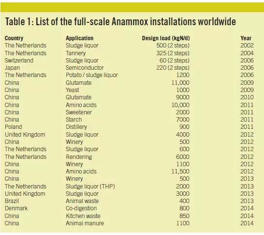 截止2015年1月,已經(jīng)有25個厭氧氨氧化項目在建設或運行,每日處理的氨氮已經(jīng)超過75噸。表1中列出了相關項目的信息。