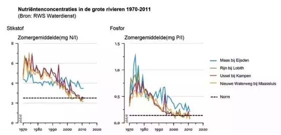 1970-2011年間荷蘭四大河流的氮磷濃度的夏季平均值,左圖為氮,右圖為磷,虛線為目標(biāo)值,單位是mg/L(來源:RWSWaterdienst)