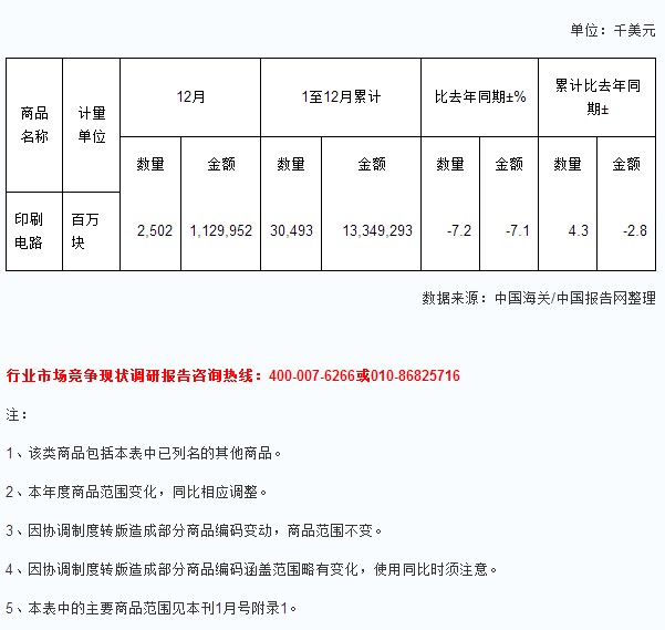 2013年1-12月中國印刷電路出口量及增速統(tǒng)計(jì)