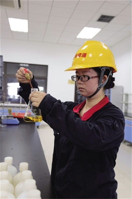 技術(shù)人員往鍋爐補(bǔ)給水樣品中加入試劑,測試其堿度。