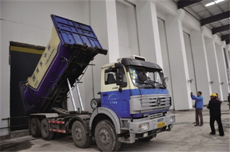 密閉的環(huán)衛(wèi)轉(zhuǎn)運(yùn)車駛?cè)胄读洗髲d,將生活垃圾傾入垃圾儲(chǔ)坑,準(zhǔn)備焚燒。