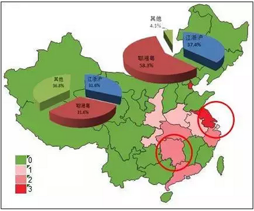 2015年上半年全國(guó)土壤修復(fù)類項(xiàng)目主要分布在11個(gè)省直轄市地區(qū),且主要集中在江浙滬、鄂湘粵地區(qū)。兩地區(qū)項(xiàng)目數(shù)量均占比31.6%,總計(jì)占比63.2%;投資金額分別占比37.4%和58.3%,總計(jì)占比達(dá)95.7%??梢钥吹浇銣?、鄂湘粵仍舊是土壤修復(fù)的主力市場(chǎng)(圖2)。