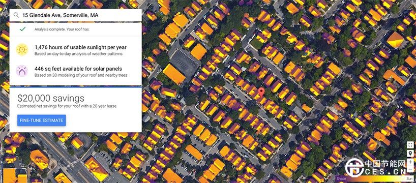 谷歌剛剛推出了一個名為“采光屋頂計劃”(Project Sunroof)的項目,可以幫助你了解自家房頂是否適合安裝太陽能電池板。你只要在谷歌提供的工具中搜索自家地址就可以獲得相關(guān)信息,進(jìn)而判斷你是否適合使用太陽能電池板這種可再生能源。谷歌此舉目的是為了鼓勵更多的人在自家屋頂上安裝太陽能電池板,從而減少碳排放對環(huán)境的污染,以實現(xiàn)全民節(jié)能環(huán)保的奮斗目標(biāo)。為了計算數(shù)據(jù)的準(zhǔn)確,“采光屋頂”項目要全面考慮當(dāng)?shù)氐奶鞖?、房頂朝向以及附近的樹木和建筑對房頂?shù)恼趽醯纫幌盗锌陀^存在因素。這些都可以通過航空影像,3D建模,計算機(jī)算法等技術(shù)來得知。