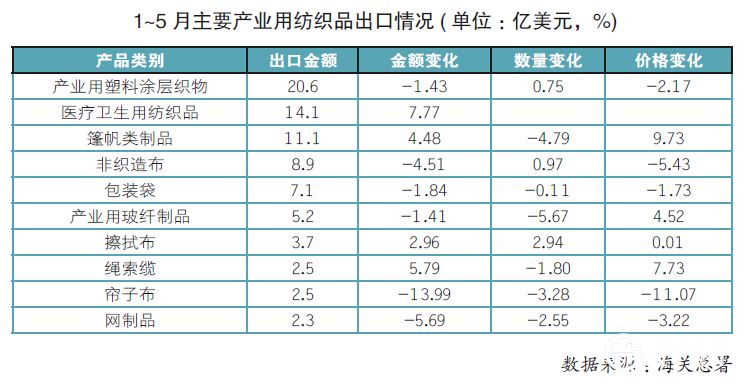 1~5月,行業(yè)出口各類(lèi)產(chǎn)業(yè)用紡織品84.5億美元,與去年基本持平,僅增長(zhǎng)0.79%。產(chǎn)業(yè)用塑料涂層織物、醫(yī)療衛(wèi)生用紡織品、篷帆類(lèi)制品、非織造布和包裝袋是主要的出口產(chǎn)品,五類(lèi)產(chǎn)品的出口額占總量的73.2%。這五類(lèi)主要產(chǎn)品中,醫(yī)療衛(wèi)生用紡織品和篷帆類(lèi)制品的出口金額保持了正增長(zhǎng),特別是篷帆類(lèi)制品的出口單價(jià)保持了近10%的增長(zhǎng),在出口數(shù)量降低近5%的情況下出口額增長(zhǎng)了4.48%。產(chǎn)業(yè)用塑料涂層織物、非織造布和包裝袋的出口則負(fù)增長(zhǎng),其中非織造布的出口額下降了4.51%。