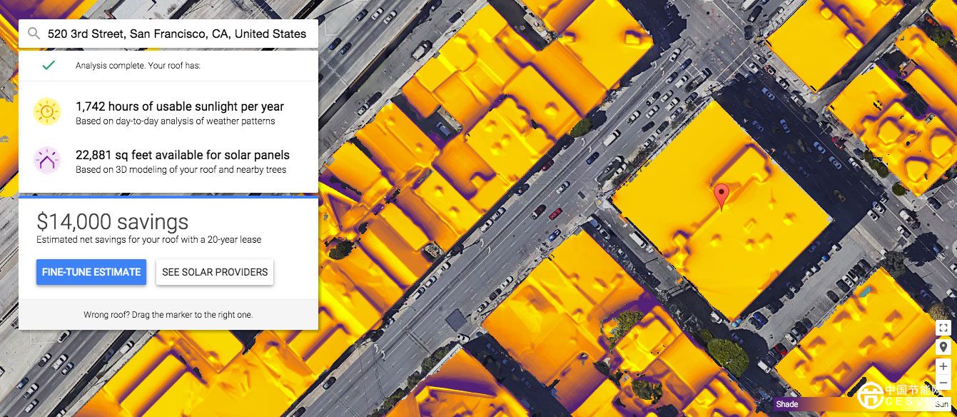 它是一款線上評估地圖,在你計劃給家里裝個太陽能屋頂?shù)珜Υ艘桓[不通時,它會告訴你該怎么操作,對自己家來說是不是一筆劃算的投資。