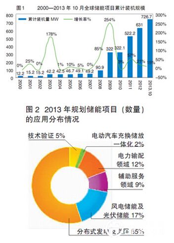 作為新興產(chǎn)業(yè),儲能在2008年之后一直保持較快增長(圖1),據(jù)中關(guān)村儲能產(chǎn)業(yè)技術(shù)聯(lián)盟(China Energy Storage Alliance,CNESA)項(xiàng)目庫不完全統(tǒng)計(jì),全球儲能項(xiàng)目在電力系統(tǒng)的裝機(jī)總量已經(jīng)從2008年的不足100MW發(fā)展到2013年10月的 726.7MW(不包含抽水蓄能、壓縮空氣儲能及儲熱),年復(fù)合增長率(CAGR)達(dá)到193%。從地域分布上看,無論是項(xiàng)目數(shù)量還是裝機(jī)規(guī)模,美國都占據(jù)領(lǐng)先地位,裝機(jī)比重占全球的45%。從技術(shù)分類上看,鈉硫電池的裝機(jī)比重最大,為46%;鋰離子電池則是應(yīng)用領(lǐng)域最廣的儲能技術(shù)。從應(yīng)用分類上看,儲能技術(shù)較多地應(yīng)用于風(fēng)電場、光伏電站及分布式發(fā)電和微網(wǎng)領(lǐng)域。