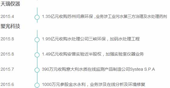 雖然離“水十條”出臺已經(jīng)過去了四個多月,但概念退燒并不意味著政策規(guī)劃帶來的真金白銀退燒。水處理行業(yè)依然是帶動環(huán)保行業(yè)上行的主要力量,水處理投資標的依然是業(yè)內(nèi)業(yè)外企業(yè)感興趣的目標。“水十條”中“地表水、地下水、陸地、海洋污染同時整治的,實施從源頭到水龍頭全過程嚴格監(jiān)管的目標”“加強行政執(zhí)法與刑事司法銜接,完善監(jiān)督執(zhí)法機制;健全水環(huán)境監(jiān)測網(wǎng)絡(luò),形成跨部門、區(qū)域、流域、海域的污染防治協(xié)調(diào)機制”等內(nèi)容毫無疑問利好水質(zhì)及污染物監(jiān)測業(yè)務(wù)。可以看到,在此利好之下,四家企業(yè)最新的并購標的全部和水業(yè)有關(guān):兩家水質(zhì)監(jiān)測儀器企業(yè),兩家水處理工程企業(yè)。