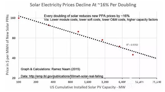 如果累計(jì)裝機(jī)容量翻一倍,那么電價(jià)就會(huì)按照一個(gè)可預(yù)見的規(guī)律下降。在太陽能組件方面,成本是以20%的速率下降。而就太陽能發(fā)電系統(tǒng)整體的發(fā)電成本而言,則是以16%的速度下降(通過組件成本降低、軟成本降低、運(yùn)營和維修成本降低、規(guī)模擴(kuò)大等因素來實(shí)現(xiàn))。這個(gè)16%的速率意味著每當(dāng)太陽能發(fā)電裝機(jī)裝機(jī)容量翻一倍,就可以使新增裝機(jī)的電價(jià)減少16%,而且這個(gè)降價(jià)速率未來還會(huì)更快。