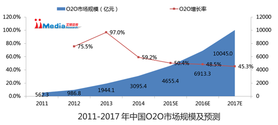 iiMediaResearch(艾媒咨詢)數據顯示,2014年中國O2O市場規(guī)模已達3095.4億元,預計2015年國內O2O市場規(guī)模將超過4600億元。