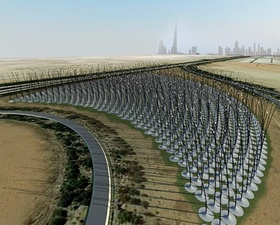 美國(guó)的太陽(yáng)風(fēng)塔能源公司申請(qǐng)了一個(gè)專(zhuān)利,利用太陽(yáng)熱能產(chǎn)生風(fēng),通過(guò)風(fēng)來(lái)發(fā)電。該裝置是建造一個(gè)摩天高塔,在頂部噴射霧狀水,水霧化蒸發(fā)吸收熱量,降低流進(jìn)空氣的溫度,同時(shí)增加了空氣密度,是空氣順?biāo)布铀傧蛳铝鲃?dòng),到達(dá)風(fēng)塔底部時(shí),風(fēng)速達(dá)到22米/秒??諝獾竭_(dá)底部后被導(dǎo)向風(fēng)電機(jī),進(jìn)行發(fā)電。