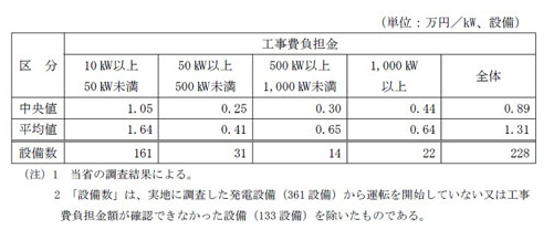 總務(wù)省在回答“認(rèn)為施工費(fèi)太高”或者“主要因?yàn)槭┕べM(fèi)太高而放棄運(yùn)轉(zhuǎn)”的798套設(shè)備中任意抽出了361套,去掉尚未開始運(yùn)轉(zhuǎn)或者無法確認(rèn)施工費(fèi)金額的133套設(shè)備,調(diào)查了剩余的228套設(shè)備的施工費(fèi)金額。結(jié)果為,施工費(fèi)中值在(1)輸出功率在10kW以上50kW以下時(shí)為1.05萬日元/kW;(2)輸出功率在50kW以上500kW以下時(shí)為0.25萬日元/kW;(3)輸出功率在500kW以上1000kW以下時(shí)為0.30萬日元/kW;(4)輸出功率在1000kW以上時(shí)為0.44萬日元/kW,全體的中值為0.89萬日元/kW。