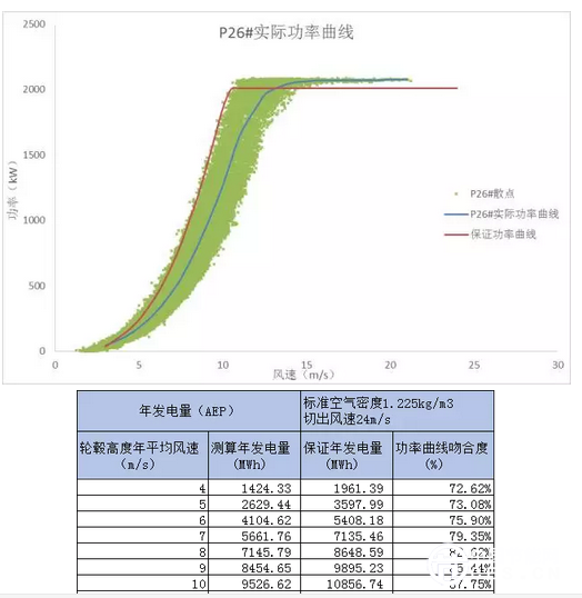 但通過(guò)該風(fēng)機(jī)附近的生產(chǎn)測(cè)風(fēng)塔,按照IEC61400-12-1規(guī)范對(duì)功率曲線進(jìn)行標(biāo)定(如下圖所示),從瑞利分布的計(jì)算結(jié)果來(lái)看,功率曲線在不同風(fēng)速下的吻合度僅在73%到89%之間,因設(shè)備性能不達(dá)標(biāo)導(dǎo)致的平均電量損失將達(dá)到20%以上。